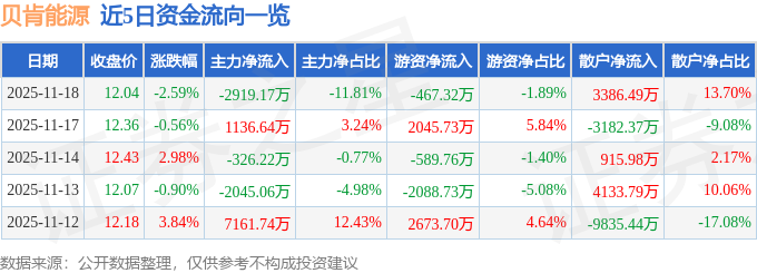 证券之星消息,截至2025年11月18日收盘,贝肯能源(002828)报收于12.04元,下跌2.59%,换手率10.56%,成交量20.44万手,成交额2.47亿元。