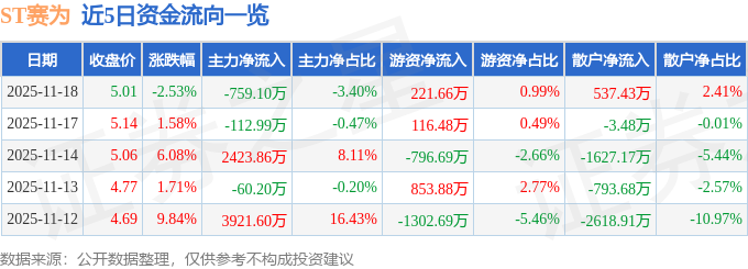 证券之星消息,截至2025年11月18日收盘,ST赛为(300044)报收于5.01元,下跌2.53%,换手率6.09%,成交量43.58万手,成交额2.23亿元。