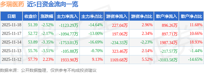 证券之星消息,截至2025年11月18日收盘,多瑞医药(301075)报收于51.39元,下跌2.52%,换手率1.85%,成交量1.48万手,成交额7670.38万元。