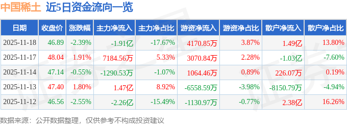 证券之星消息,截至2025年11月18日收盘,中国稀土(000831)报收于46.89元,下跌2.39%,换手率2.16%,成交量22.92万手,成交额10.79亿元。