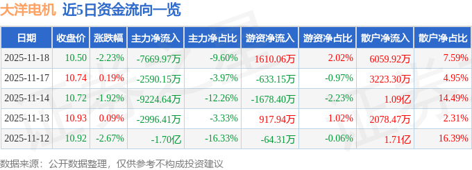 证券之星消息,截至2025年11月18日收盘,大洋电机(002249)报收于10.5元,下跌2.23%,换手率4.12%,成交量75.38万手,成交额7.99亿元。