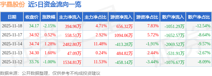 证券之星消息,截至2025年11月18日收盘,宇晶股份(002943)报收于34.17元,下跌2.15%,换手率1.84%,成交量2.44万手,成交额8385.9万元。