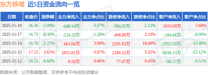证券之星消息,截至2025年11月18日收盘,东方铁塔(002545)报收于16.36元,下跌2.09%,换手率0.98%,成交量11.04万手,成交额1.82亿元。