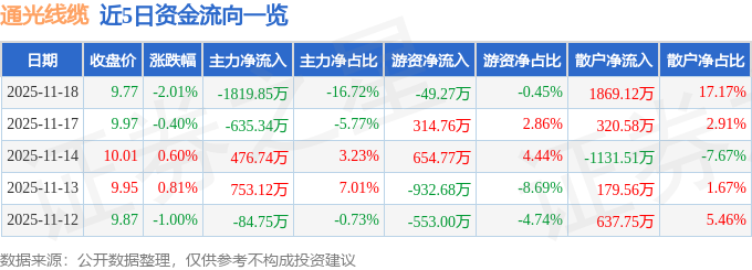 证券之星消息,截至2025年11月18日收盘,通光线缆(300265)报收于9.77元,下跌2.01%,换手率2.38%,成交量11.14万手,成交额1.09亿元。