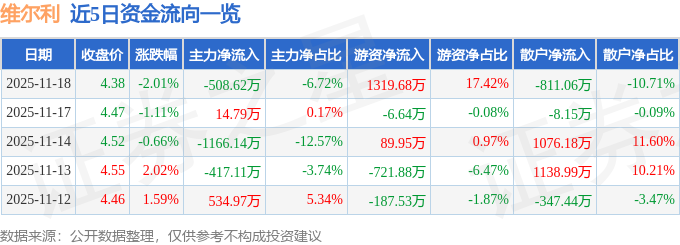 证券之星消息,截至2025年11月18日收盘,维尔利(300190)报收于4.38元,下跌2.01%,换手率2.16%,成交量17.34万手,成交额7573.7万元。