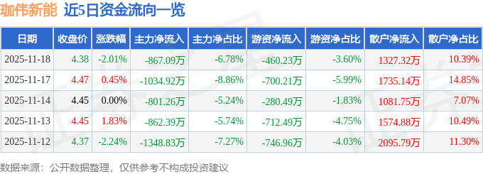 证券之星消息,截至2025年11月18日收盘,珈伟新能(300317)报收于4.38元,下跌2.01%,换手率3.53%,成交量29.26万手,成交额1.28亿元。