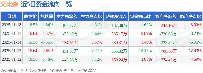 证券之星消息,截至2025年11月18日收盘,艾比森(300389)报收于16.53元,下跌1.84%,换手率2.1%,成交量4.91万手,成交额8127.66万元。