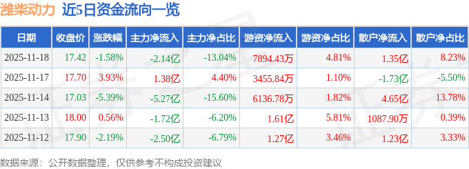 证券之星消息,截至2025年11月18日收盘,潍柴动力(000338)报收于17.42元,下跌1.58%,换手率1.88%,成交量93.85万手,成交额16.41亿元。