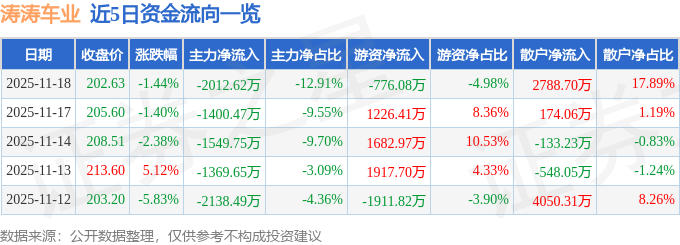 证券之星消息,截至2025年11月18日收盘,涛涛车业(301345)报收于202.63元,下跌1.44%,换手率2.64%,成交量7676.0手,成交额1.56亿元。