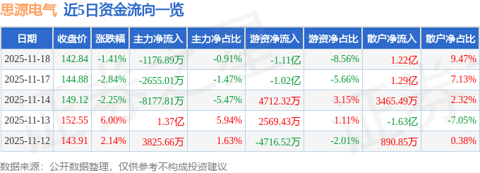 证券之星消息,截至2025年11月18日收盘,思源电气(002028)报收于142.84元,下跌1.41%,换手率1.48%,成交量9.02万手,成交额12.92亿元。
