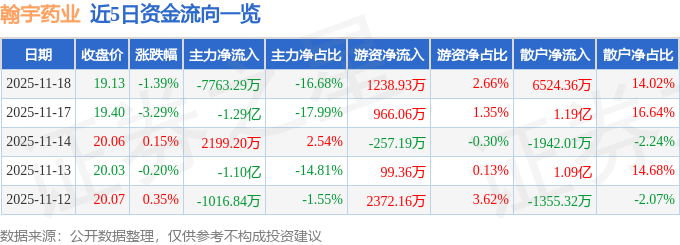 证券之星消息,截至2025年11月18日收盘,翰宇药业(300199)报收于19.13元,下跌1.39%,换手率3.23%,成交量24.12万手,成交额4.65亿元。