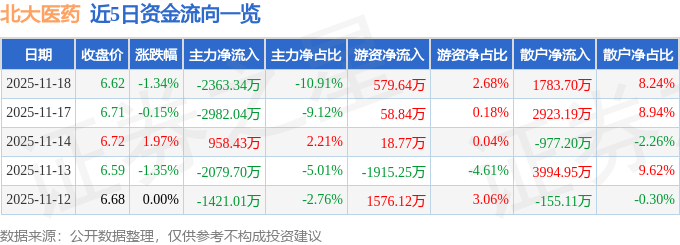 证券之星消息,截至2025年11月18日收盘,北大医药(000788)报收于6.62元,下跌1.34%,换手率5.48%,成交量32.67万手,成交额2.17亿元。