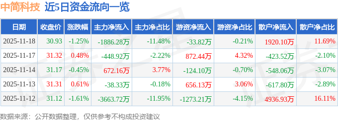 证券之星消息,截至2025年11月18日收盘,中简科技(300777)报收于30.93元,下跌1.25%,换手率1.26%,成交量5.32万手,成交额1.64亿元。