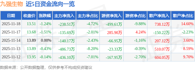 证券之星消息,截至2025年11月18日收盘,九强生物(300406)报收于13.51元,下跌1.24%,换手率0.88%,成交量3.72万手,成交额5057.21万元。