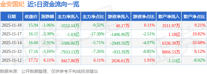 证券之星消息,截至2025年11月18日收盘,金安国纪(002636)报收于15.94元,下跌1.06%,换手率3.29%,成交量23.81万手,成交额3.81亿元。