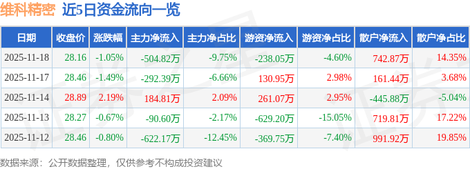 证券之星消息,截至2025年11月18日收盘,维科精密(301499)报收于28.16元,下跌1.05%,换手率5.34%,成交量1.85万手,成交额5178.45万元。