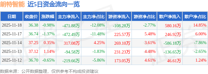 证券之星消息,截至2025年11月18日收盘,朗特智能(300916)报收于36.38元,下跌0.98%,换手率1.15%,成交量1.07万手,成交额3906.32万元。