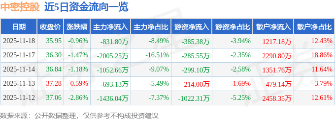 证券之星消息,截至2025年11月18日收盘,中密控股(300470)报收于35.95元,下跌0.96%,换手率1.38%,成交量2.73万手,成交额9793.03万元。