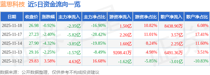 证券之星消息,截至2025年11月18日收盘,蓝思科技(300433)报收于26.98元,下跌0.92%,换手率1.04%,成交量51.47万手,成交额13.89亿元。