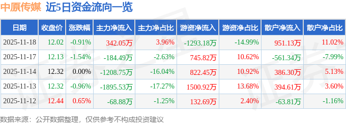 证券之星消息,截至2025年11月18日收盘,中原传媒(000719)报收于12.02元,下跌0.91%,换手率1.08%,成交量7.17万手,成交额8629.49万元。