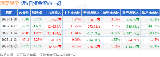 证券之星消息,截至2025年11月18日收盘,通灵股份(301168)报收于46.89元,下跌0.7%,换手率1.8%,成交量1.72万手,成交额8004.88万元。