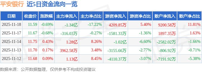 证券之星消息,截至2025年11月18日收盘,平安银行(000001)报收于11.59元,下跌0.69%,换手率0.35%,成交量67.01万手,成交额7.79亿元。