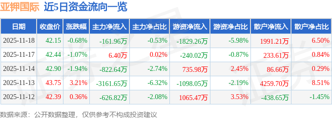 证券之星消息,截至2025年11月18日收盘,亚钾国际(000893)报收于42.15元,下跌0.68%,换手率0.91%,成交量7.35万手,成交额3.06亿元。