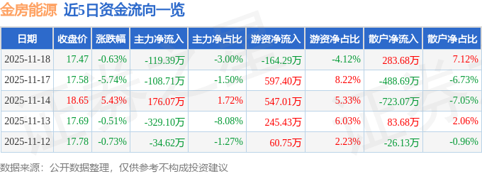 证券之星消息,截至2025年11月18日收盘,金房能源(001210)报收于17.47元,下跌0.63%,换手率2.39%,成交量2.28万手,成交额3983.37万元。