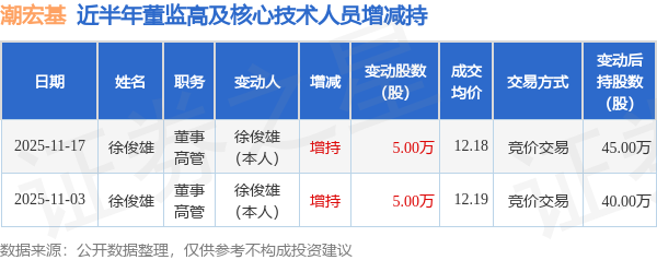 证券之星消息,根据11月18日市场公开信息、上市公司公告及交易所披露数据整理,潮宏基(002345)最新董监高及相关人员股份变动情况:2025年11月17日公司董事,高管徐俊雄共增持公司股份5.0万股,占公司总股本为0.0056%。变动期间公司股价下跌1.37%,11月17日当日收盘报12.24元。