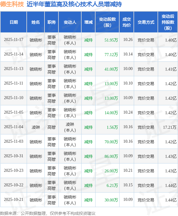 德生科技近半年内的董监高及核心技术人员增减持详情如下: