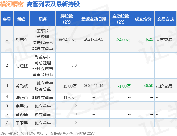 证券之星消息,根据11月18日市场公开信息、上市公司公告及交易所披露数据整理,横河精密(300539)最新董监高及相关人员股份变动情况:2025年11月17日公司董事,高管黄飞虎共减持公司股份8000.0股,占公司总股本为0.003%。变动期间公司股价上涨7.53%,11月17日当日收盘报48.15元。