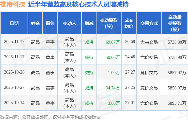 雄帝科技近半年内的董监高及核心技术人员增减持详情如下:
