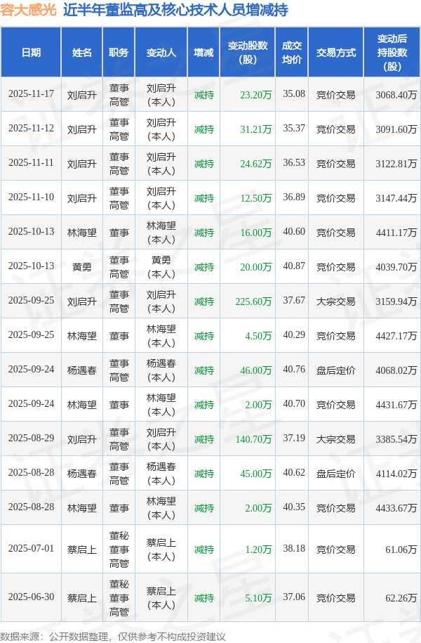 容大感光近半年内的董监高及核心技术人员增减持详情如下: