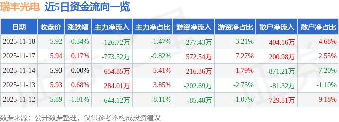证券之星消息,截至2025年11月18日收盘,瑞丰光电(300241)报收于5.92元,下跌0.34%,换手率2.49%,成交量14.62万手,成交额8644.72万元。
