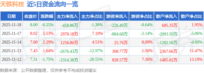 证券之星消息,截至2025年11月18日收盘,天铁科技(300587)报收于8.0元,下跌0.25%,换手率4.22%,成交量44.4万手,成交额3.52亿元。