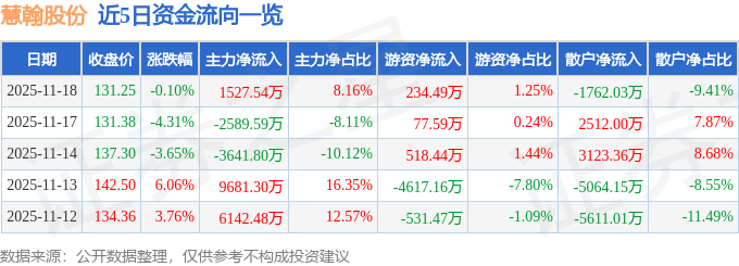 证券之星消息,截至2025年11月18日收盘,慧翰股份(301600)报收于131.25元,下跌0.1%,换手率4.42%,成交量1.43万手,成交额1.87亿元。