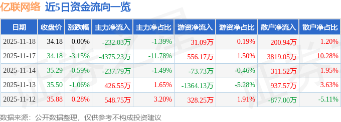 证券之星消息,截至2025年11月18日收盘,亿联网络(300628)报收于34.18元,上涨0.0%,换手率0.67%,成交量4.88万手,成交额1.67亿元。