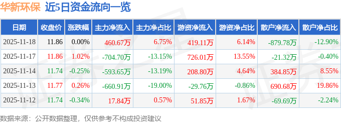 证券之星消息,截至2025年11月18日收盘,华新环保(301265)报收于11.86元,上涨0.0%,换手率3.46%,成交量5.83万手,成交额6821.62万元。