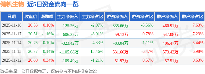 证券之星消息,截至2025年11月18日收盘,健帆生物(300529)报收于20.53元,上涨0.1%,换手率0.58%,成交量2.95万手,成交额6041.59万元。
