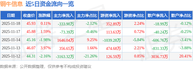 证券之星消息,截至2025年11月18日收盘,铜牛信息(300895)报收于45.93元,上涨0.11%,换手率2.48%,成交量3.42万手,成交额1.58亿元。