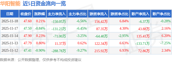 证券之星消息,截至2025年11月18日收盘,华阳智能(301502)报收于47.6元,上涨0.21%,换手率2.03%,成交量4790.0手,成交额2286.97万元。