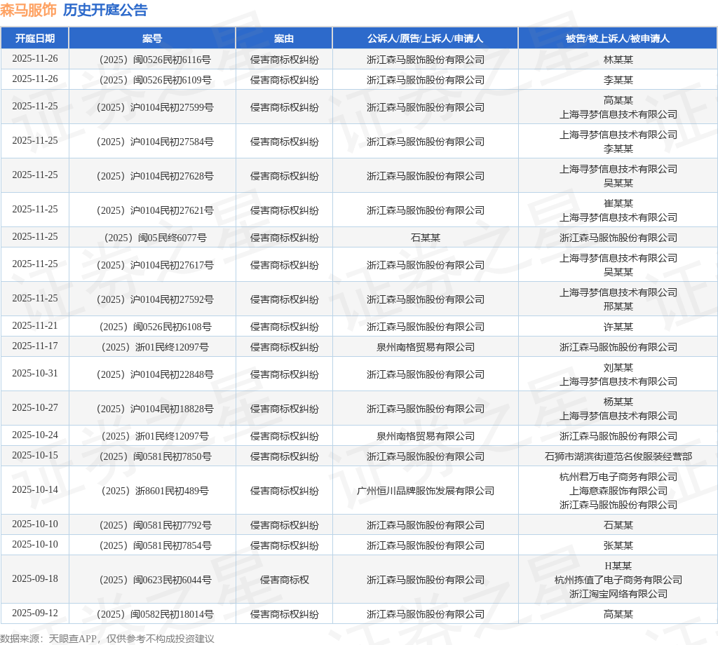 案号:(2025)闽0526民初6108号根据统计,近一年内以浙江森马服饰股份有限公司为当事人的历史开庭公告有44则,其中案由为“侵害商标权纠纷”的公告以37则居首,其次为“侵害商标权”有5则,“侵害商标权及不正当竞争纠纷”有1则。历史开庭公告(前20条)如下: