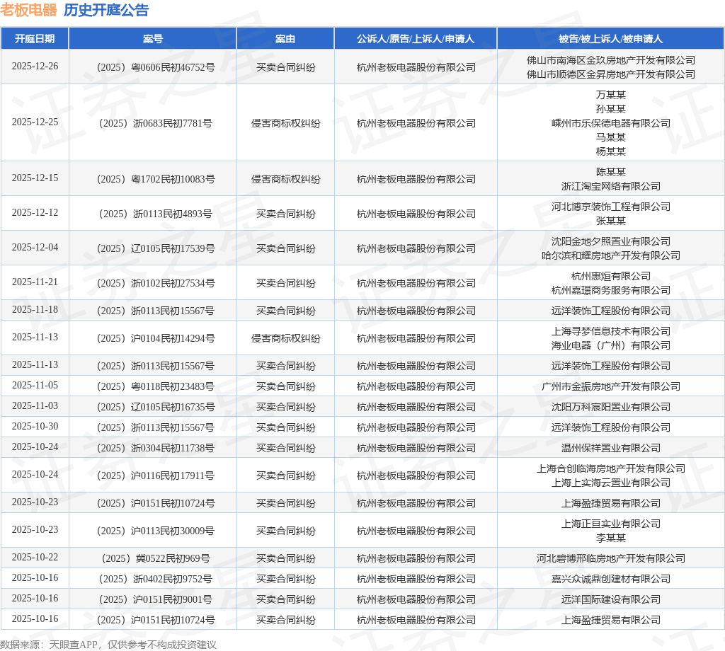 案号:(2025)浙0102民初27534号根据统计,近一年内以杭州老板电器股份有限公司为当事人的历史开庭公告有225则,其中案由为“买卖合同纠纷”的公告以150则居首,其次为“侵害商标权纠纷”有43则,“承揽合同纠纷”有5则。历史开庭公告(前20条)如下: