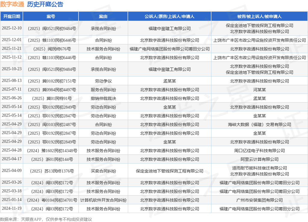 案号:(2025)闽民终676号根据统计,近一年内以北京数字政通科技股份有限公司为当事人的历史开庭公告有20则,其中案由为“技术服务合同纠纷”的公告以6则居首,其次为“劳动合同纠纷”有4则,“合同纠纷”有3则。历史开庭公告如下: