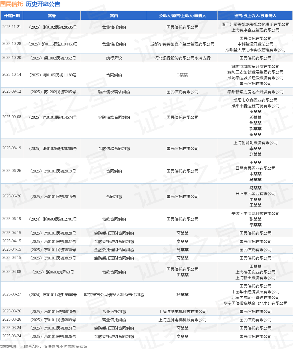 案号:(2025)浙0102民初28535号根据统计,近一年内以国民信托有限公司为当事人的历史开庭公告有35则,其中案由为“金融委托理财合同纠纷”的公告以7则居首,其次为“合同纠纷”有5则,“金融借款合同纠纷”有5则。历史开庭公告(前20条)如下:
