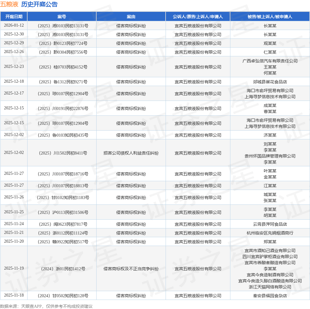 案号:(2025)浙0112民初11124号根据统计,近一年内以宜宾五粮液股份有限公司为当事人的历史开庭公告有339则,其中案由为“侵害商标权纠纷”的公告以301则居首,其次为“商标权权属、侵权纠纷”有16则,“侵害商标权”有6则。历史开庭公告(前20条)如下:
