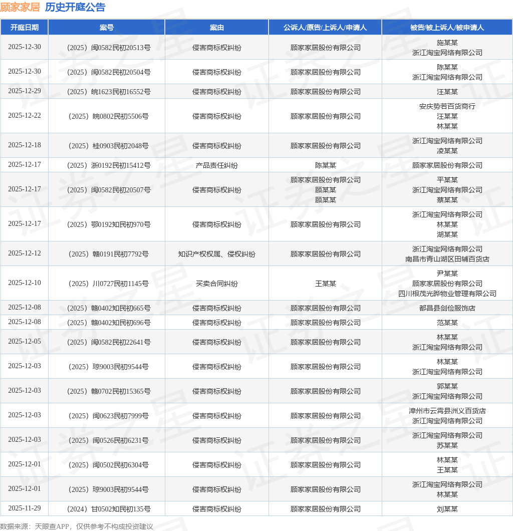 案号:(2025)赣0702民初11244号根据统计,近一年内以顾家家居股份有限公司为当事人的历史开庭公告有219则,其中案由为“侵害商标权纠纷”的公告以178则居首,其次为“买卖合同纠纷”有7则,“商标权权属、侵权纠纷”有7则。历史开庭公告(前20条)如下:
