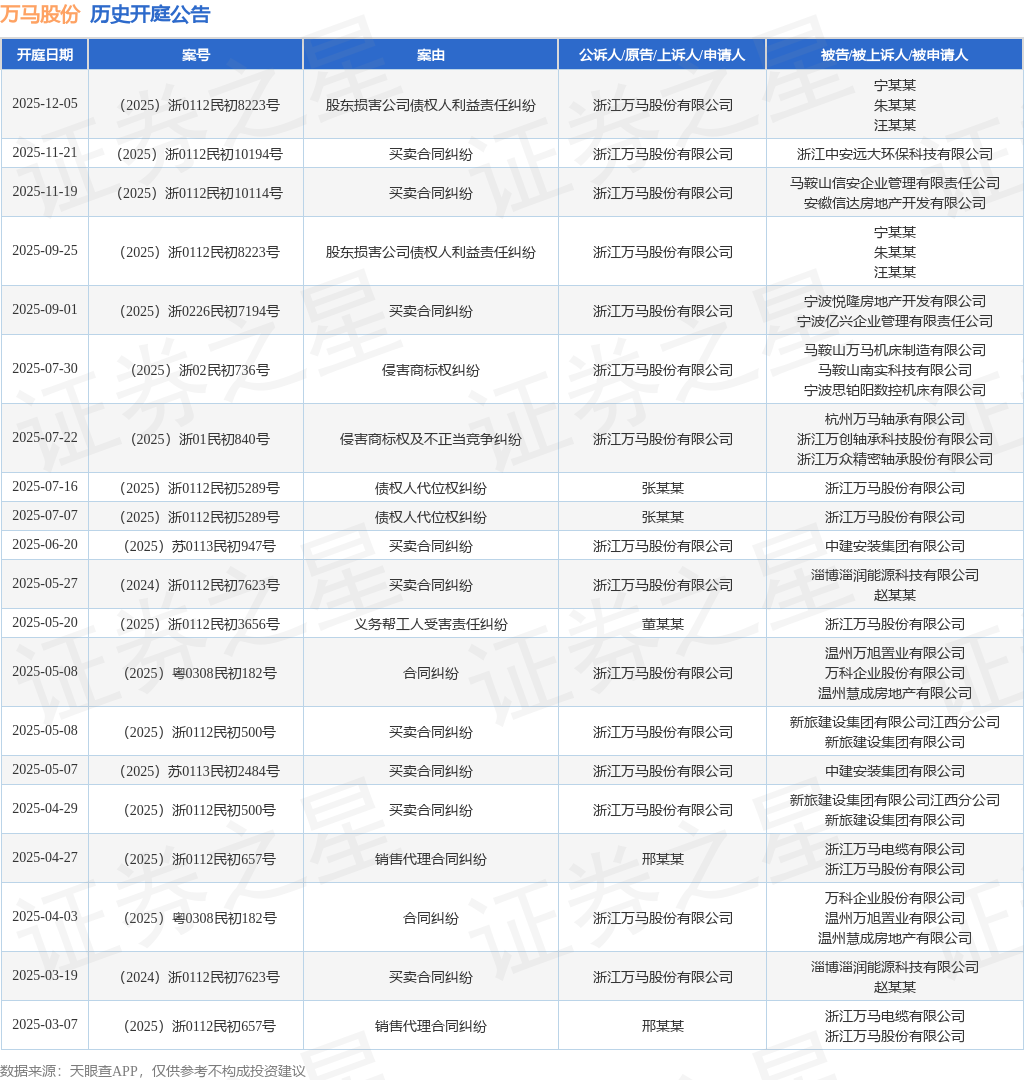 案号:(2025)浙0112民初10194号根据统计,近一年内以浙江万马股份有限公司为当事人的历史开庭公告有27则,其中案由为“买卖合同纠纷”的公告以12则居首,其次为“合同纠纷”有6则,“债权人代位权纠纷”有2则。历史开庭公告(前20条)如下: