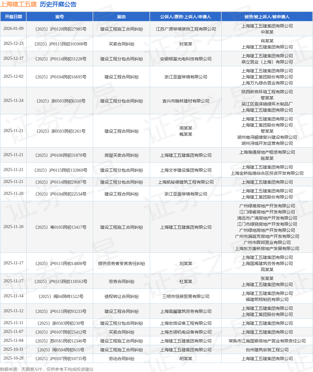 案号:(2025)沪0106民初31870号根据统计,近一年内以上海建工五建集团有限公司为当事人的历史开庭公告有294则,其中案由为“建设工程施工合同纠纷”的公告以57则居首,其次为“建设工程分包合同纠纷”有56则,“劳务合同纠纷”有34则。历史开庭公告(前20条)如下: