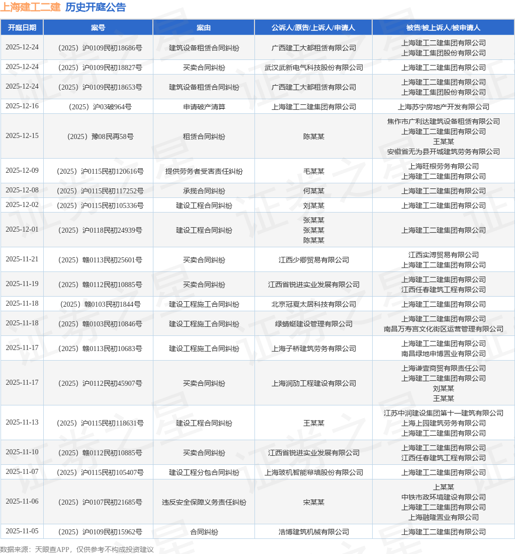 案号:(2025)赣0113民初25601号根据统计,近一年内以上海建工二建集团有限公司为当事人的历史开庭公告有263则,其中案由为“建设工程施工合同纠纷”的公告以71则居首,其次为“买卖合同纠纷”有29则,“建设工程分包合同纠纷”有28则。历史开庭公告(前20条)如下: